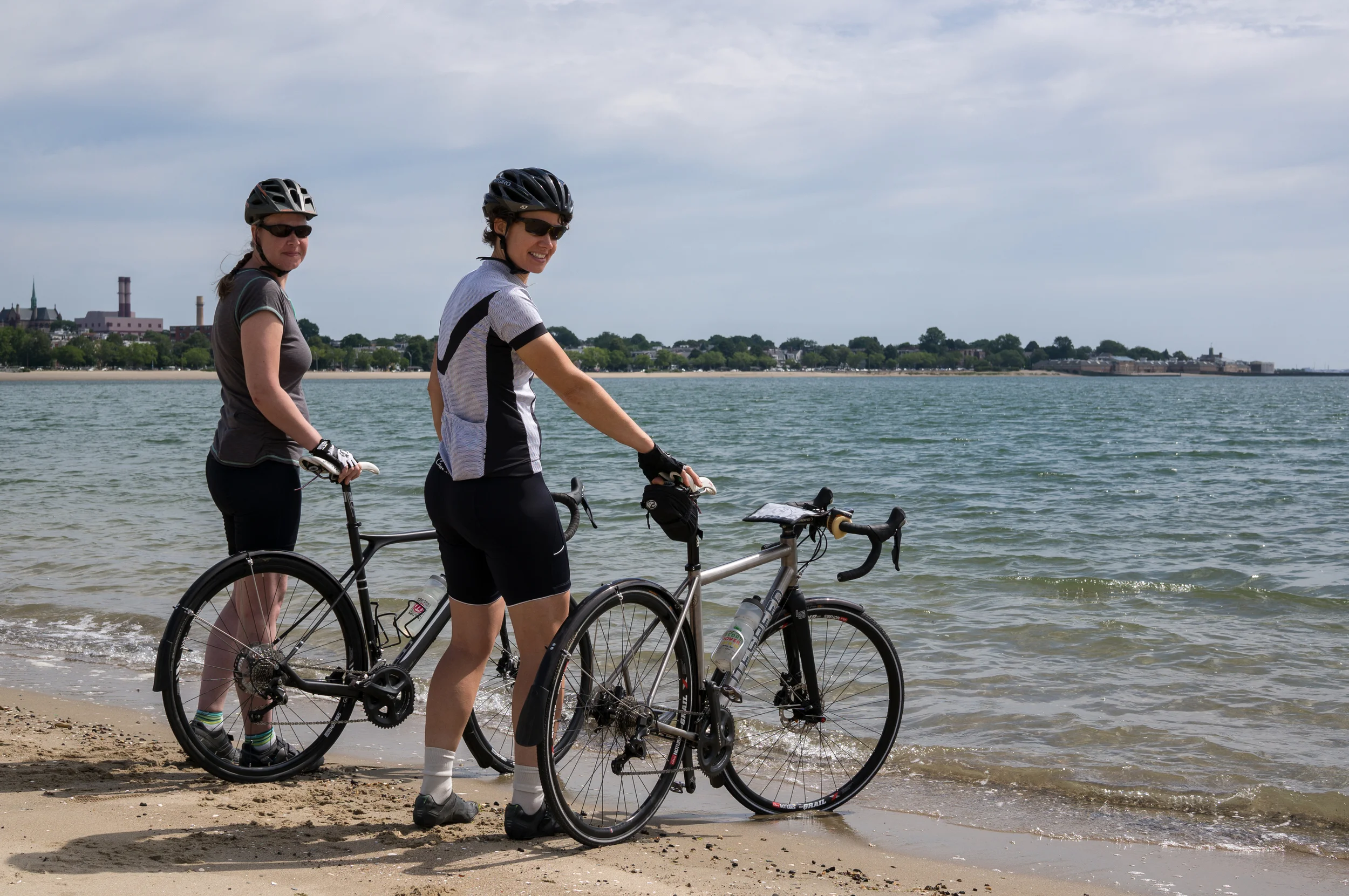 We chose to set off on this beautiful Sunday morning from downtown Boston - no traffic, great weather, easy-going drivers (for MA that is). South Boston locals out playing tag football and sunning on the beach, and Heather and I carrying bikes through the sand to do a ceremonial Atlantic Ocean dip. Our send off was quiet, just us and my husband who kindly drove us down and took photos. We had South Boston streets mostly to ourselves, before hitting the chaotic streets of downtown Boston, crossing the Charles River, up Memorial Drive, through Harvard Square, Porter Square, and downtown Arlington to drop our bikes off for the FINAL modifications (new saddles!, fit and fender tweaks) at Quad Cycles. Thank you to Ben Maguire for looking after us so well, it has been a real pleasure working with him and this bike shop. We'll have to go back in the morning to collect them again for the next stage. We're happy to be started on such a gorgeous day, and looking forward to getting some real mileage in soon.