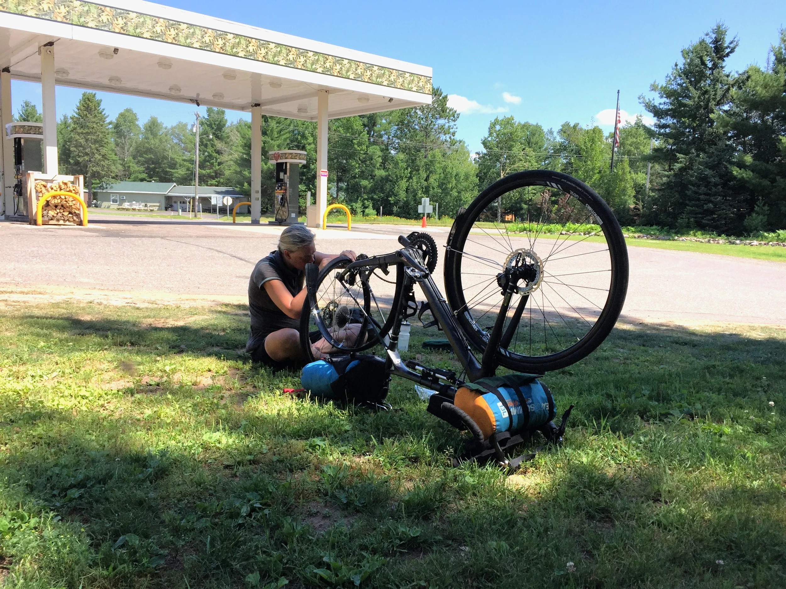 I head to the New Moon bike shop, where all that I really need is a cleat screw. I am also having some knee trouble - my cleat position is still not quite dialed in. I hang out at the bike shop like a groupie, asking for advice on whatever I can think of. I'm really waiting for Heather to arrive, which eventually starts to look like might not happen in time for them to do any repair-work before the shop closes. The owner and/or manager is a star - he gives me all kinds of valuable advice and some gear, including the cleat screw, deer-fly patches, and some shims to put in my shoes that will slightly change my foot angle and hopefully ease some knee pain. I get camp alternatives to the KOA from him as well, and one of the mechanics.